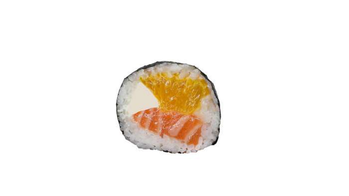 Nori, ryż, łosoś, ser, pomarańcza, sos słodki , masago arare Cena dania zawiera oplatę za opakowanie jednorazowe